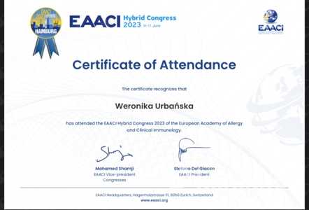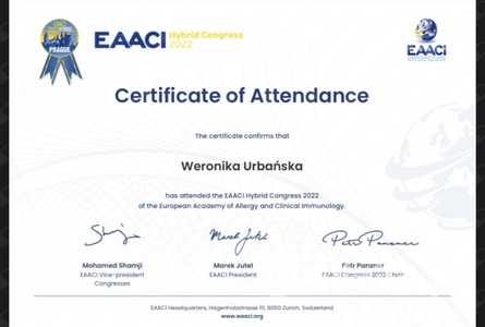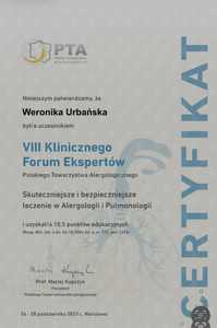 Lista 9 certyfikatów otrzymanych przez lek. Weronika Urbańska, potwierdzające kwalifikacje specjalisty.