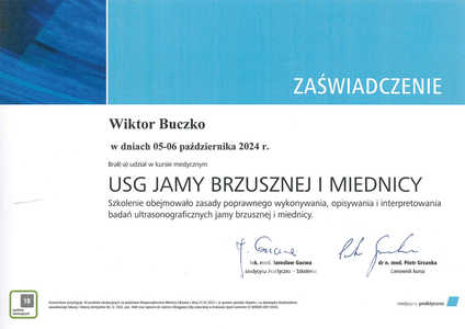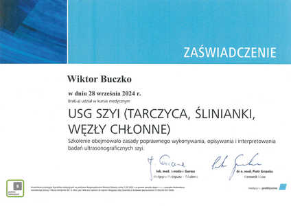 Lista 2 certyfikatów otrzymanych przez lek. Wiktor Buczko, potwierdzające kwalifikacje specjalisty.