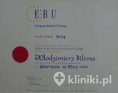 Lek. Włodzimierz Klima ukończył Śląską Akademię Medyczną w 1999 roku, uzyskując dyplom i prawo do wykonywania zawodu lekarza. Po zakończeniu studiów rozpoczął specjalizację z chirurgii ogólnej, którą uzyskał w 1995 roku. Kolejną specjalizację, drugiego stopnia z urologii (Fellow of European Board of Urology ), otrzymał w 2001 roku. Za obronę pracy doktorskiej na temat raka nerki na Uniwersytecie Jagiellońskim w Krakowie otrzymał tytuł doktora nauk medycznych.