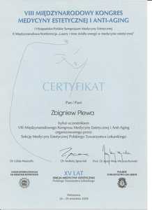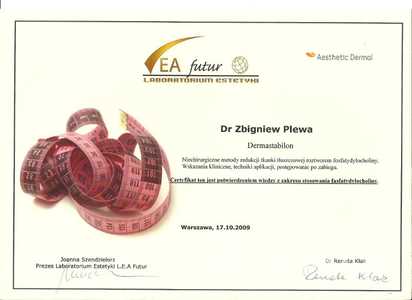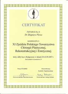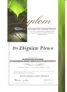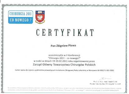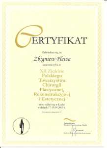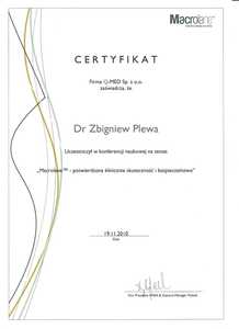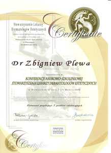 Lista 9 certyfikatów otrzymanych przez dr n. med. Zbigniew Plewa, potwierdzające kwalifikacje specjalisty.