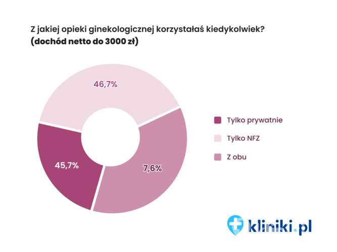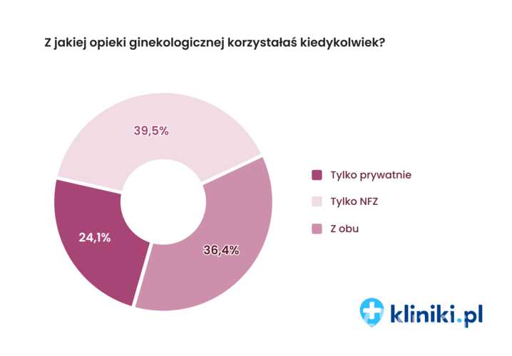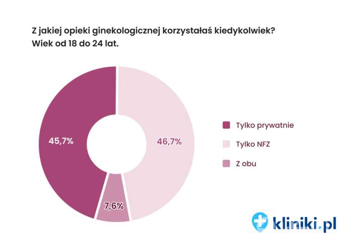 Szczególnie młodsze kobiety odchodzą od opieki oferowanej przez NFZ. W grupie wiekowej 18–24 lata aż 46,7% kobiet wybiera wyłącznie prywatne wizyty, co jest wynikiem wyższym niż w przypadku pacjentek korzystających tylko z NFZ.